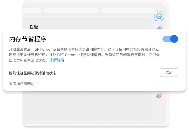 GPT浏览器有着启动加速与智能释放标签等内置功能,可以显著提升浏览器性能,占用更低内存,速度更快!